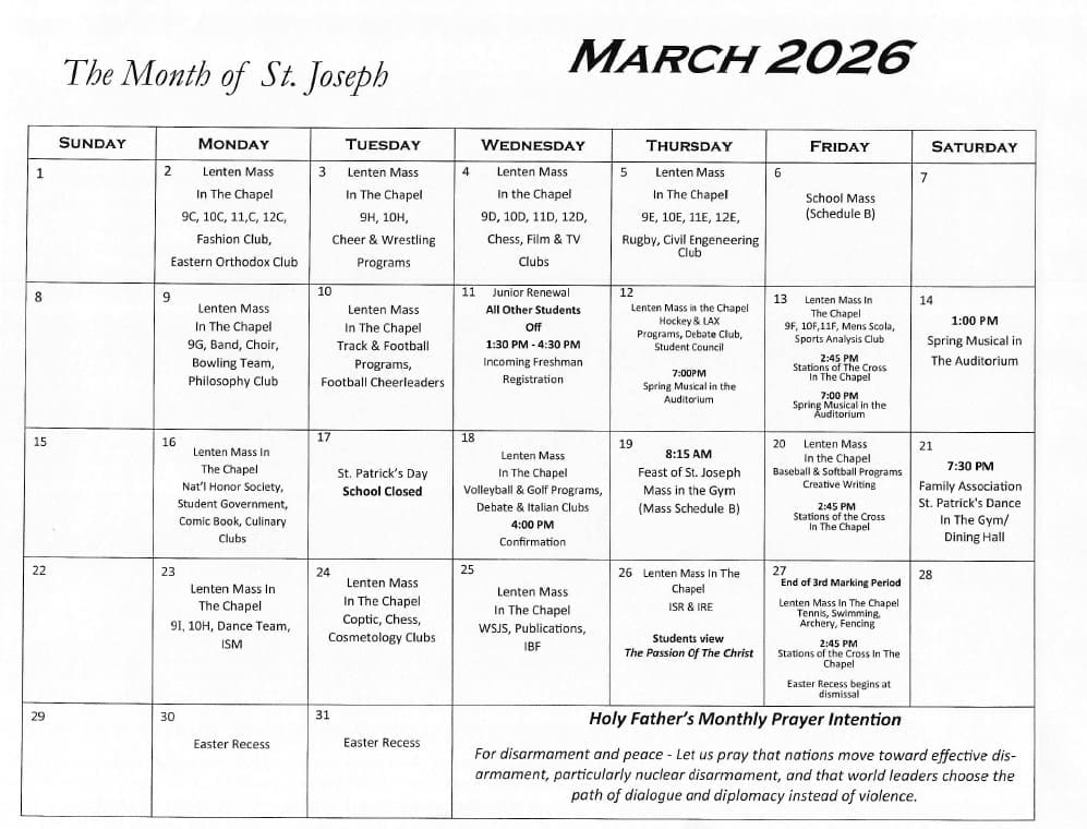 We are Catholic. The Gospel is the foundation and purpose of all that we do. Therefore, we seek to form young men and women in the image of Jesus Christ. This formation is the deliberate effort of administration, faculty, and parents. We strive to help students grow spiritually, academically, athletically, and socially. This will prepare them to take up their personal and social responsibility in the City of Man during their pilgrimage toward the City of God.